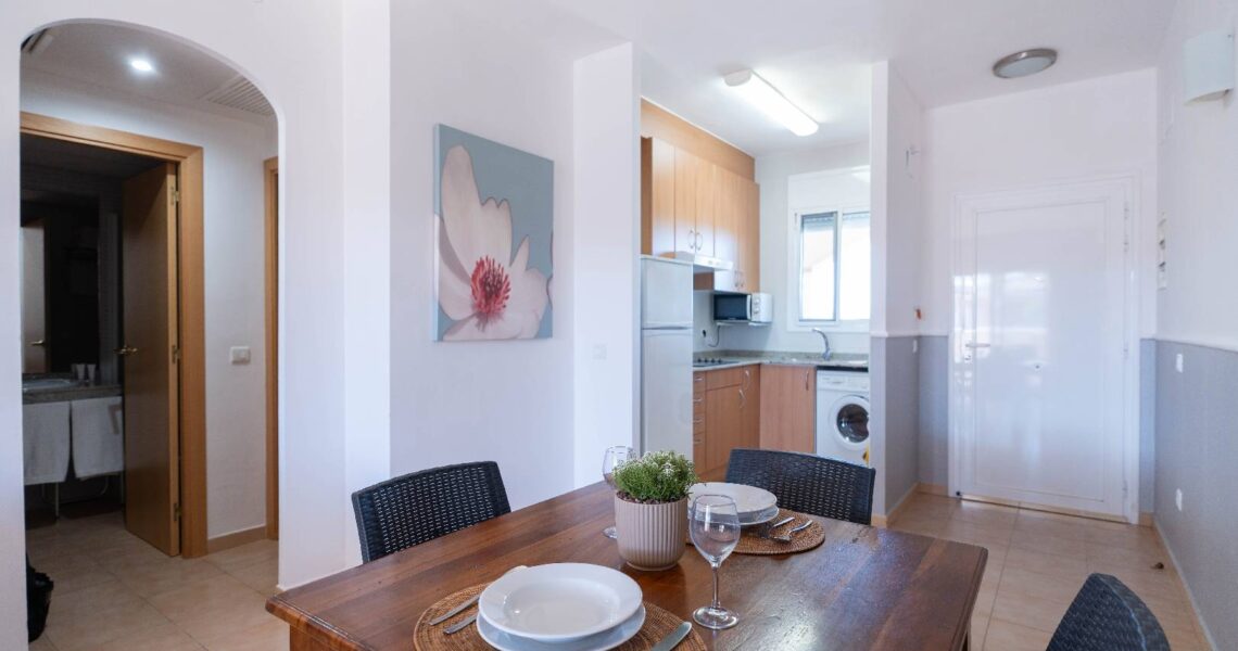 Cocina totalmente equipada con encimera eléctrica, lavadora, nevera, microondas, utensilios y menaje.